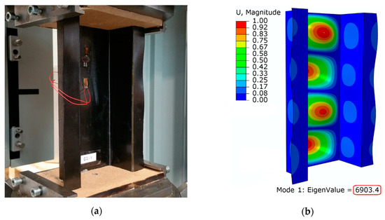 The numerical and experimental research made it possible to evaluate the critical and post-critical condition of the structure. Preliminary analyses were aimed at evaluating the form of deformation of a thin-walled structure at the moment of loss of stability. The numerical calculations estimated that buckling of the composite column occurred with a load of Pcr = 6903.4 N. The buckling mode obtained from experimental and numerical studies is presented in Figure 8.