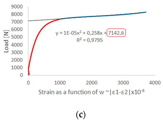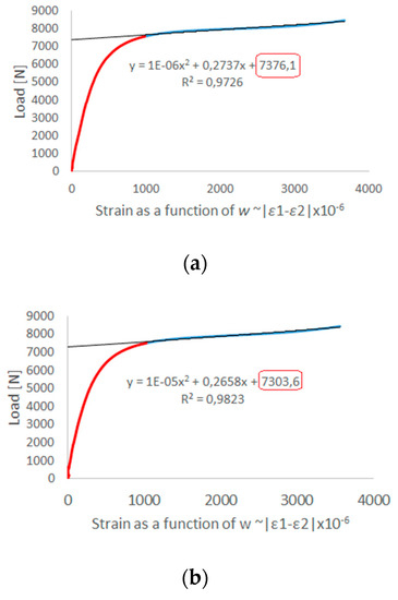 In both cases a high correlation was observed, which is the result of the obtained form of deformation of the structure in a critical state, where four half-waves are visible with the loss of stability of the structure. As part of the experimental tests, values of critical load were determined using the second order Koiter’s method. The effective range of the experimental curve was approximated by the second order polynomial. The determinant of the appropriate selection range of the approximated experimental curve was a correlation coefficient in the range of R2 ≥ 0.95. Figure 9 shows the determined critical load values as the last components of the approximation functions from three tests.