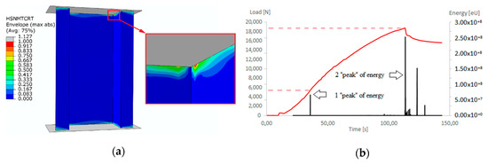 The damage initiation: (a) FEM–HSNMTCRT (matrix tension); (b) experimental results (first peak of energy—damage initiation, and second peak of energy—damage evolution).
