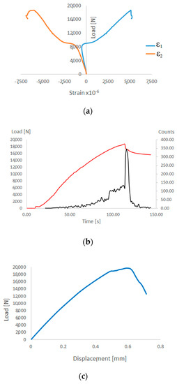On the basis of numerical analyses based on the PFA, it was estimated that the value of load causing loss of load-carrying capacity Pf-FEM = 19,723 N. For experimental tests, the load causing a sudden loss of stiffness was Pf-EXP = 18,697 N. The discrepancy between the results of the limit loads was only 5.2%. After achieving one of the four parameters of the Hashin’s criterion, the stiffness of this parameter is gradually degraded according to the scheme shown in Figure 2. Further loads on the structure cause the damage parameter 1 to be achieved by successive parameters of the Hashin’s criterion, which also activates a gradual process of stiffness degradation of these parameters. As a consequence, there is a gradual loss of stiffness of the composite material until the moment of total loss of stiffness of the material. This is a long-term process carried out in numerical calculations using the incremental-iteration method until the moment of losing the ability to carry the load through the compressed structure. In the experimental studies (AEM), a sudden increase in the counts parameter (equal 350) was observed after 120 s of real time, which corresponded to the maximum load (loss of load-carrying capacity) recorded experimentally on a Universal Testing Machine—Figure 11b. An increase in counts may indicate progressive damage (complex state of damage) of the composite structure. The characteristics showing loss of load-carrying capacity in experimental (strain measurement, acoustic emission) and numerical tests are shown in Figure 11.
