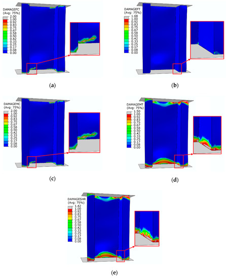 Figure 12 presents maps showing the level of damage evolution after total failure of each structure.