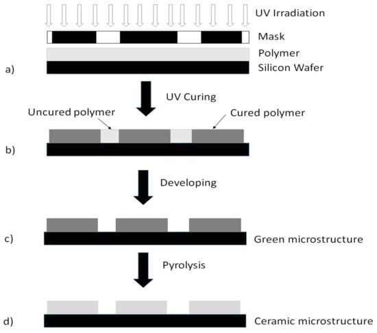 - Schulz, M.; Börner, M.; Hausselt, J.; Heldele, R. Polymer derived ceramic microparts from x-ray lithography-cross-linking behavior and process optimization. J. Eur. Ceram. Soc. 2005, 25, 199–204. [Google Scholar] [CrossRef]