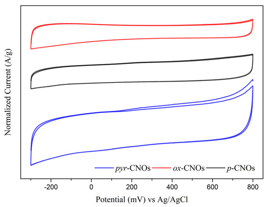 Table 2 summarizes the specific capacitances that were obtained for the p-CNOs, ox-CNOs and pyr-CNOs, which were calculated with a scan rate of 30 mV/s. The specific capacitance could also be calculated from Equation (2):