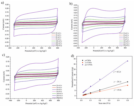 Dependence of the CV curves on the scan rate in the (a) p-CNOs, (b) ox-CNOs, and (c) pyr-CNOs. (d) Linear regression of the current density against the scan rate.