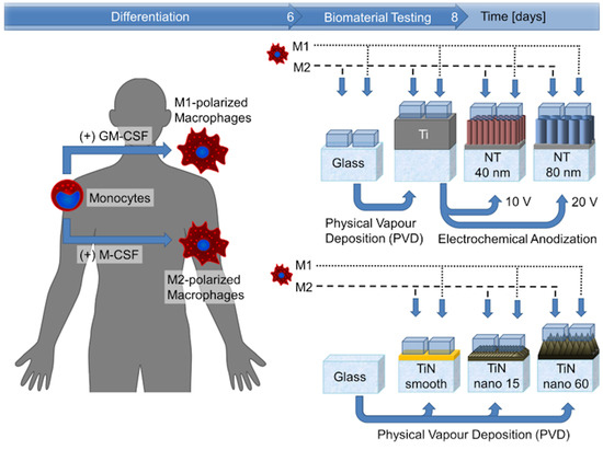 All implanted biomaterials induce cellular and tissue responses that finally result in the encapsulation of the foreign body [1]. In this wound healing process, macrophages play a pivotal role. Macrophages originate from monocytes that rapidly differentiate when recruited in the context of inflammation [39,40]. At the wound site, macrophages exhibit a spectrum of polarization ranging from pro-inflammatory to anti-inflammatory and pro-healing character, depending on their specific phenotype. Hereby, M1-polarized macrophages are associated with pro-inflammation, whereas M2 macrophages are the dominant phenotype in the remodeling phase of wound healing [41]. Thus, the impact of a biomaterial on a specific macrophage phenotype is of interest for the improvement of implant materials. A possibility to control the macrophage polarization is to equip an implant with a nanotopography, which can be generated in many different styles, such as nanotubes or pyramid-like fractal nanostructures. The first can be generated on a variety of different implant materials by coating the material with Ti, and subsequently introduce the nanostructure by electrochemical anodization, the latter can be directly produced by a PVD process. Due to the opportunity to fabricate tubular and fractal surface structures, with tunable dimensions in the nanoregime, by simply varying easy-accessible process parameters, such as the anodization voltage or PVD process time. Both PVD and electrochemical anodization achieve a high effectiveness and reproducibility. The controlled fabrication and reproducibility is a prerequisite to studying the impact of different nanostructure dimensions on material-resident cells [42].