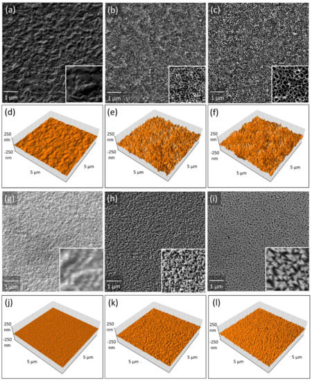 The nanotubular and untreated coatings were additionally investigated by AFM. Figure 2d–f displays three-dimensional (3D) views of the Ti coated glass slides and the nanotubular samples, while Figure 2j–l presents 3D views of the TiN coatings. Figure 1e shows the surface of the untreated Ti coating with a dense and smooth surface. The anodization in electrolytes containing hydrofluoric acid significantly increased the roughness of the treated surfaces (Table 2), whereby this effect was enhanced for the higher anodization voltage of 20 V (Figure 2d–f) [36]. The AFM analysis further demonstrated that the TiN control surface generated on a heated substrate had the smoothest surface of all examined samples (Figure 2j). The roughness of the TiN coatings showing pyramid-like nanostructures significantly increased, compared to the smooth control surface, and also increased with extending deposition time and size of the nanostructures.