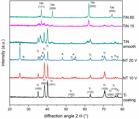 The XRD analysis detected for all samples both signals from the underlying Ti coating and the top layer of TiN. Due to the thickening of the TiN top layer, the signal intensity attributed to the underlying Ti coating decreased, while the intensity of the TiN signals increased with the extension of the deposition time. The signals detected in the XRD analysis, which could be attributed to the different TiN layers could be assigned to a δ-TiN lattice with fcc crystal structure [29].