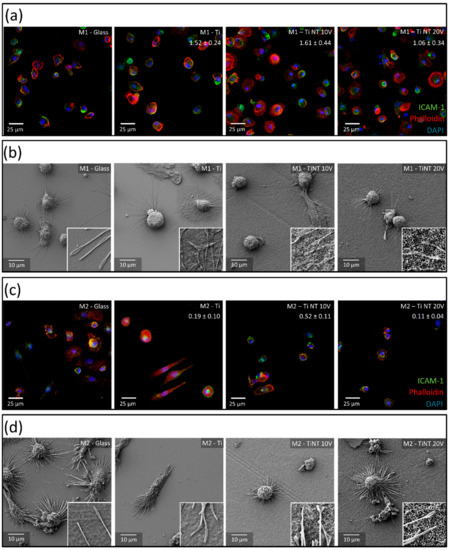 After 48 h of culture on the generated Ti and nanotube surfaces and glass as a control, material-resident cells were stained with DAPI, Phalloidin and ICAM-1 (Figure 4a,c) demonstrating a material-specific cell pattern. On glass surfaces, both phenotypes exhibited a rather round cell morphology, whereas on Ti surfaces most M2 macrophages took an elongated shape. The shape of M1 macrophages on Ti was comparable to their shape on glass. On the nanotubes, the M1 macrophages’ morphology was similar to that on glass and on unstructured Ti. In contrast to M1 macrophages, both nanotubular topographies had a strong impact on M2 phenotype macrophages. The elongated cell morphology found on flat Ti turned to a round cell shape with a cytoplasm closely organized around the nucleus.