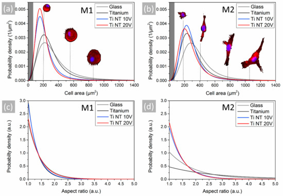 Statistical analysis of cell morphology. Probability density of (a,b) cell area and (c,d) aspect ratio for the M1- and M2-polarized macrophages on glass, Ti and the Ti nanotubes (NT) surfaces obtained from fluorescence microscopy images. Data were merged for all five donors. Images of cells typically found at a size indicated by the dashed lines are inserted into the graphs to facilitate conceivability. The darkened parts in graph (a,b) indicate the range of cell size where no cells could be detected.