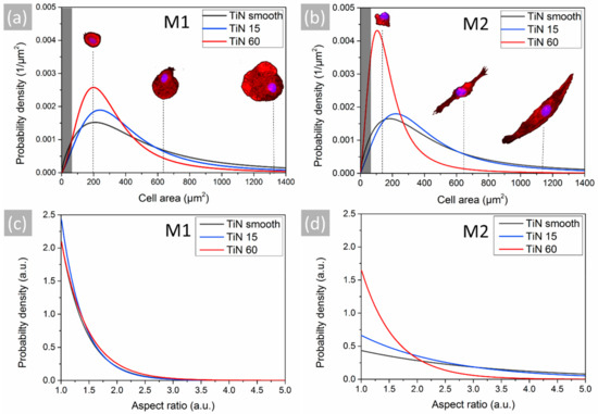 Statistical analysis of cell morphology. Probability density of (a,b) cell area and (c,d) aspect ratio for the M1- and M2-polarized macrophages on smooth and nanorough TiN surfaces obtained from fluorescence microscopy images. Data were merged for all three donors. Images of cells typically found at a size indicated by the dashed lines are inserted into the graphs to facilitate conceivability. The darkened parts in graph A and B indicate the range of cell size where no cells could be detected.
