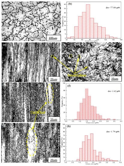 Optical micrographs and average grain size of alloy extruded at different temperatures: (a,b) As-cast; (c,d) 250 °C; (e,f) 300 °C; (g,h) 350 °C.