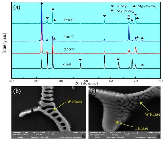 (a) XRD patterns of Mg-2Y-1Zn-0.6Zr alloy corresponding to the as-cast and as-extruded specimens; (b) micromorphology of W; (c)micromorphology of I.