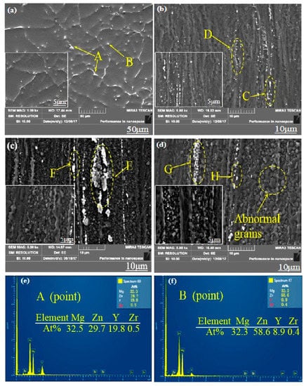 SEM micrographs of Mg-2Y-1Zn-0.6Zr as-cast and -extruded alloy: (a)As-cast; (b) 250 °C; (c) 300 °C; (d) 350 °C; (e,f) EDS spectra of extruded alloy.