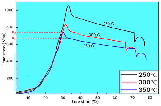 Take the extrusion at 350 °C for example, as shown in the compression curve during hot extrusion (Figure 4), the stress increases with strain at first and the curve becomes gentle after reaching the maximum value σ2. This is because work hardening predominates before the peak σ2 that only partial dynamic recrystallization occurs in the metal, resulting the work hardening effect is greater than the softening effect of dynamic recrystallization. When the stress reaches the maximum value σ2, as the dynamic recrystallization accelerates, the softening effect is greater than the hardening effect and the stress begins to decrease. The work hardening effect caused by deformation tends to balance with the softening effect caused by dynamic recrystallization, therefore the work hardening rate is zero and the curve enters a stable state, finally the curve is close to a horizontal line that deformation can continue to occur under the action of stress σ1. Therefore, only partial dynamic recrystallization did occur during processing at 250 °C temperature, which cause the stress required for extrusion is relatively large. From the extrusion process, we can control the size of the subcrystal by adjusting the temperature that rapidly cooling in the initial stage of dynamic recrystallization and preserving the dynamically recrystallized structure to obtain a metal material with a very fine grain to increase the strength of the metal [16].