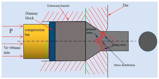 At higher temperatures (300 °C and 350 °C), although the alloy undergoes dynamic recrystallization in most areas while there are still a few areas (Figure 1e,g) where did’t occur dynamic recrystallization were extruded into strip. Moreover, the W phase and I phase are also extruded into a strip shape and distributed along the extrusion direction. The main reason for the absence of dynamic recrystallization in some areas is the extrusion stress inhomogeneity during deformation. As shown in the Figure 5, when the magnesium alloy bar is extruded, the surface metal flows slowly while the middle metal flows fast due to the frictional resistance of the die orifice. Moreover, the outer layer is pulled and the middle metal is pressed, which causes the magnesium alloy rod is unevenly stressed and the degree of deformation is not uniform during the extrusion process. Dynamic recrystallization can easily occur at some areas where the relative large deformation amount combined with a suitable deformation temperature. Those regions with large amount deformation combined with a suitable temperature above the hot working temperature of the material prioritize to occur dynamic recrystallization than other areas [8,17]. What’s more, because a large number of deformation dislocations used to form sub-crystals are also concentrated in a large deformation region, thus the driving force for crystallization in this area is larger. However, in some regions where deformation is not enough big to store the energy of recrystallization nucleation, which cause the dynamic recrystallization is not easy to occur (Figure 1e,g).