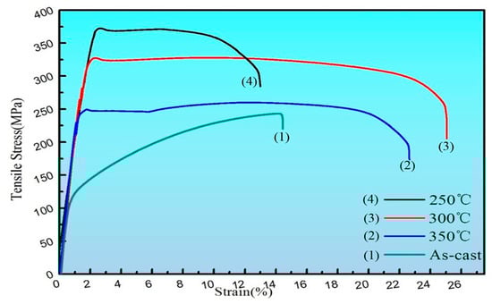 The W phase and quasi-crystal I phase belong to the hard and brittle phase according to some relevant researches [14,15]. The broken second phase (W phase and I phase) distributed on the magnesium matrix during the hot extrusion process effectively hinders the movement of dislocations and has a certain effect on the improvement of the material strength. Moreover, what more important is that these broken second phases hinder the migration of grain boundaries, thus hindering the abnormal growth of the grains caused by excessive temperature and helping to obtain fine grains during dynamic recrystallization. When the extrusion temperature is 250 °C, there is not enough energy to active dislocations and grain boundary movement due to the low extrusion temperature below the recrystallization temperature, so there is no much dynamic recrystallization occurs apparently. In addition, though the W phase and I phase are crushed into particles (Figure 3b), the effect of preventing dislocations and grain boundary movement is not effectively exerted. At 350 °C extrusion temperature, the grain boundary and dislocations get sufficiently high activation energy to get itself moved, but most of the crushed second phase has dissolved into the α-Mg matrix at relative higher extrusion temperature (Figure 3d), which results in the migration of grain boundary and dislocations not being hindered and contributing crystal grains grow into some coarse grains. When the extrusion temperature is 300 °C, the broken second phase is not dissolved into the crystal absolutely (Figure 3c), therefore effectively hindering the migration of the grain boundary and the growth of the crystal grains. We can see from Figure 3d, that’s why there is substantially no distribution of the broken second phase around the abnormally grown grains [14].