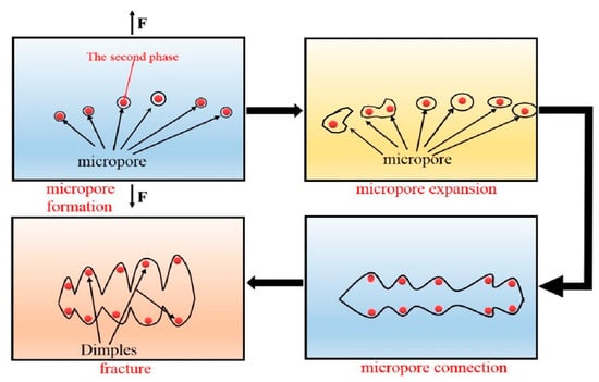 In order to further explore the fracture mechanism of the material and fully understand the form of alloy failure, we analyzed the fracture morphology of the alloy under a high-power electron microscope. As shown in the schematic Figure 7, the dimple is actually the process of formation, expansion and connection of micropores during plastic deformation [21]. We can see from Figure 8a,b that the micro-fracture morphology of the as-cast and extruded alloys at different extrusion temperature. The fracture of as-cast alloy is basically plastic fracture that there are a large number of dimples on the fracture surface. The dislocations moved plastically along the slip surface under the action of large stress, and the stress was then concentrated when the dislocation moved to the vicinity of the second-phase particles, which caused the interface between the matrix and the second phase too pen to form micropores. Micropore expansion and connection were also the result of plastic deformation of the base metal. What caused the unstable fracture of the material was the metal between the adjacent micropores causing large plastic deformation when the micropores were expanded to a certain extent [22]. Therefore, we can see from Figure 8a that there were many small dimples distributed around some large dimples formed by the aggregation of small dimples, eventually leading to the fracture of the material.