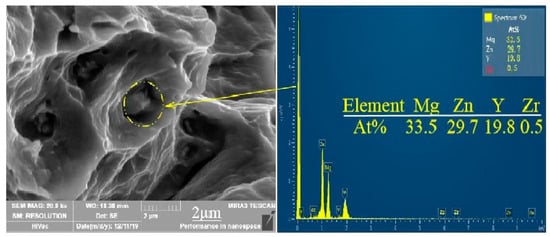 The elongation of the extruded alloy was only about 10% at an extrusion temperature of 250 °C. As shown in Figure 9c,d, the form of failure of the alloy mainly manifested as brittle fracture where the fracture surface consisted of many tearing ridges and a small amount of dimples. The alloy exhibited good ductility (elongation is 25.4%) when the extrusion temperature was 300 °C, which is owed to the grains refined by dynamic recrystallization, and so does the size of the dimples compared to that of the as-cast alloy. Therefore, the fracture of the alloy at the extrusion temperature of 300 °C is a typical microporous aggregate fracture. Moreover, the second-phase particles are clearly visible at the bottom of the dimple and confirmed to be the W phase by EDS (Figure 9). When the extrusion temperature continued to rise to 350 °C, the ductility of the material was lowered due to the local coarse crystal grains because of the excessive temperature. According to the fracture theory of crack formation in the tensile test [23], the grain size has the following relationship with the crack propagation critical stress σc, , where γp is the specific surface energy (the work consumed per unit area of surface area when the crack propagates), Ky is the Petch slope, d is the grain size, and μ the is shear modulus. Any factors that can increase σc can improve the plasticity of the material. Therefore, the alloy at the extrusion temperature of 300 °C shows higher strength and better toughness.