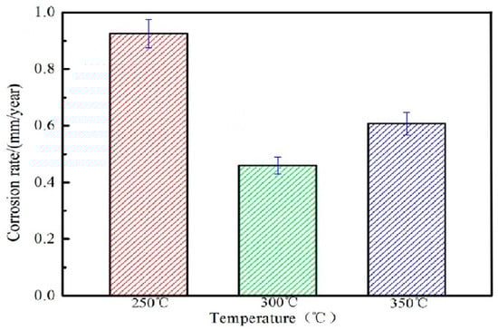 Figure 10 shows the weight loss corrosion rate of extruded Mg-2Y-1Zn-0.6Zr alloy after being immersed in SBF solution. The relationship at the corrosion rate of the alloy is E250 °C > E350 °C > E300 °C. The alloy extruded at 300 °C extrusion temperature has the best corrosion resistance 0.4601 < 0.5 mm/y and meets the requirements of bio-alloys. Based on existing researches [19,24], the undissolved second phase (W phase and I phase) on the matrix or the undynamic recrystallized area has a higher corrosion potential than that of the magnesium matrix, thus forming a primary cell that aggravates the corrosion rate of extruded alloy (at 250 °C extrusion temperature). At 300 °C extrusion temperature, the alloy undergoes relative sufficient dynamic recrystallization leads to the grains fine and uniform, which result to the corrosion performance of the alloy is the best. However, owning to the abnormal growth of crystal grains in the local region at 350 °C, the coarse microstructure reduces the corrosion resistance of the alloy.