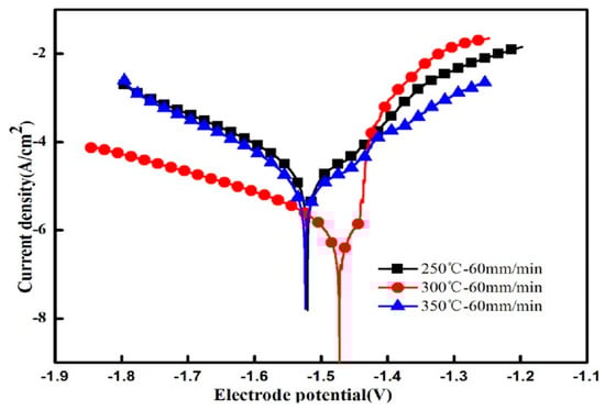 In order to further explore the corrosion resistance of extruded alloys, Figure 11 shows the electrochemical polarization curves of the alloys after extrusion at different temperatures, whereas Table 3 shows the electrochemical parameters and the weight loss corrosion rate. The electrochemical polarization curve consists of an anodic polarization curve (left side) and a cathodic polarization curve (right side). The anode generates an oxidation reaction that dissolves the magnesium matrix: , while the cathode undergoes a hydrogen evolution reduction reaction: 2H2O + 2e− → H2 + 2OH− [25]. It can be seen from the polarization curve that as the extrusion temperature increases, the self-corrosion potential Ecorr moves first in the positive direction and then in the negative direction. The self-corrosion potential is the most positive when the extrusion temperature is 300 °C while the self-corrosion current Icorr of the alloy decreases first and then increases. Corrosion potential Ecorr reflects the degree of corrosion resistance of the alloy that the more positive the potential is, the more corrosion resistant the alloy becomes. Similarly, the self-corrosion current Icorr also reflects the corrosion rate of the alloy that the slower the corrosion rate of the alloy is, the better the corrosion resistance of the alloy get. When the extrusion temperature is 300 °C, the corrosion resistance of the alloy is best with the slowest corrosion rate, which is consistent with the static immersion test results.