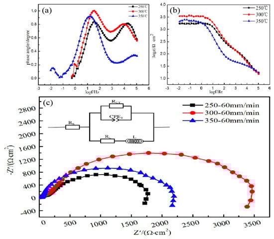 In addition, the Figure 12b show that extruded alloy at 300 °C extrusion temperature has the highest impedance value. The two peaks contained in frequency vs. degree (Figure 12a) corresponding two time constants, and the relationship of phase angle at medium frequency is E300 °C > E350 °C > E250 °C, which indicates the extruded alloy at 300 °C extrusion temperature has the best corrosion resistance again.