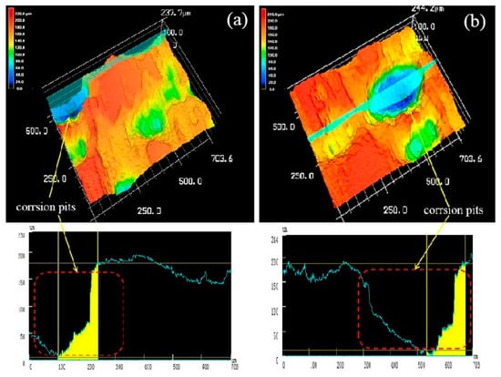 Both (a) and (b) were three-dimensional corrosion morphology of extruded alloy (250 °C) after corrosion product removal.
