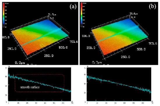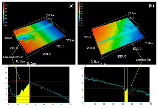 Figure 15 is a three-dimensional topographical view of the de-corroded product of the extruded alloy at an extrusion temperature of 300 °C. The alloy mainly exhibited overall mild corrosion rather than severe localized corrosion. Therefore, it can be seen from its three-dimensional corrosion topography that the corrosion surface is relatively flat and the corrosion is relatively uniform due to the uniform fine grains, there is no more serious corrosion pit in the local area [28]. The line roughness curve also had no large undulations, both surface roughness Ra of Figure 15a,b were 9 μm while the line roughness was 8 μm.