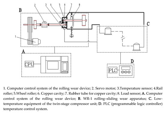The WR-1 rolling–sliding wear apparatus with a temperature-changing device was used to evaluate the wear and rolling contact fatigue (RCF) properties of D1 and D2 wheel rollers with friction pair of U71Mn rail material under different temperature conditions. As shown in Figure 2, the apparatus is composed of two rollers which served as a wheel roller (upper specimen) and as a rail roller (lower specimen). The rail roller (4) is driven by a DC motor, while the wheel roller (5) is driven via a pair of gears. A normal force (from 0 to 2000 N) is applied by a compressed spring to the upper specimen. Load sensors (8) are used to measure the tangential friction force and normal force at the wheel/rail interface (measurement error: ±5%). A low-temperature environment is created by double compressors (C) which make the refrigerant (Freon) to recirculate in the copper tube. A rubber tube (7) and copper cavity (6) connect the WR-1 rolling–sliding wear apparatus (B) to the low-temperature environment, resulting in a low temperature in the copper cavity (6) due to the flow of refrigerant. The wheel and rail rollers are installed in the copper cavity (6). High ambient temperature is reached using an electric heating tape entwined around the copper cavity (6). A digital temperature sensor (3) is fixed into the copper cavity (6) and the temperature is monitored in the cavity in real time. A PLC (Programmable Logic Controller) temperature control system (D) is used to stabilize the temperature in the copper cavity at a set value. The temperature error in the copper cavity is ±2 °C. During the experiment, the ambient temperature of the wheel and rail rollers are kept stable.