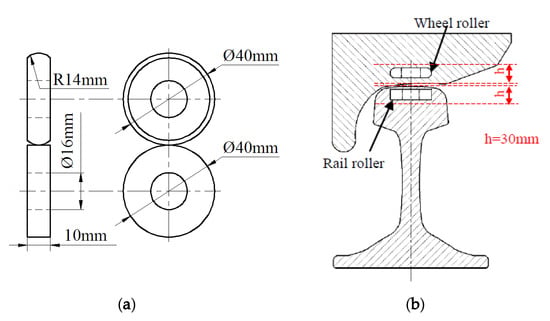 The dimensions of wheel roller (upper specimen) and rail roller (lower specimen are shown in Figure 3a. The diameter of wheel and rail rollers was 40 mm. The wheel and rail rollers were cut from the wheel tread and railhead (0–30 mm from the surface), respectively, as shown in Figure 3b. The samples were molded into 40 mm-diameter rollers through machining processes such as turning and drilling, and all rollers were polished to surface roughness (Ra) of approximately 0.15 μm. Before testing, each roller was thoroughly cleaned by ultrasonic cleaning for 15 min. The chemical compositions of wheel and rail materials in weight percentage are given in Table 1.