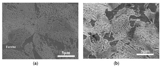 The rollers were ultrasonically cleaned in ethanol, dried, and weighed using an electronic balance (JA4103, measurement accuracy: 0.0001 g) before and after testing. Wear loss of the wheel and rail rollers was determined by calculating the mass loss. Figure 4 shows the sampling positions of the surface and cross sections in the wheel/rail rollers. Three pieces of 1 mm length separated by 120° were taken from each roller. Each section was cut along the rolling direction by wire-cutting processing, mounted in resin, ground with 2000-grit abrasive paper, polished with 0.5 μm diamond, and etched with 4% Nital. The plastic deformation of wheel and rail rollers was characterized using optical microscopy (OM) (OLYMPUS BX60M, Tokyo, Japan). Metallographic microscopy and surface and subsurface damages were inspected using scanning electronic microscopy (SEM) (QUANTA200 FEI, Eindhoven, Netherlands). Metallographic microscopy images of D1 and D2 materials are shown in Figure 5. It can be seen that pearlite composed of cementite and ferrite presents a lamellar structure, and the Pearlite lamellar spacing in D1 is larger than that in D2.