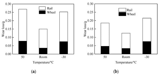 In the test, the rotational speed of the rail roller was 400 r/min, and the number of cycles was 3.84 × 105. The normal force between the wheel and the rail rollers was about 150 N. The slip ratio was 0.91%. In addition, the experiments were performed at high temperature (50 °C), room temperature (RT: 20 °C), and low temperature (−30 °C).