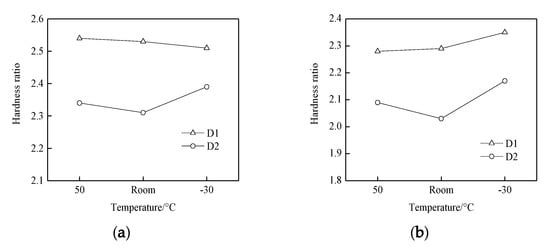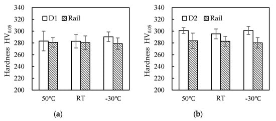 Hardness tests were conducted on the wheel and rail samples before and after the experiment. It was found that the surface hardness of D1 samples was about 285 HV0.05 before the experiment, that of D2 samples was 300 HV0.05, and that of the rail samples was 280 HV0.05 (Figure 7). When comparing the surface hardness of the wheel and rail samples before and after the experiment (Figure 8), the hardness of the wheel and rail materials after the experiment was more than twice that before the experiment. The wheel and rail samples of the D1 friction pair showed a significantly greater surface hardness ratio than those of the D2 friction pair, indicating that surface hardening of the D1 friction pair was greater than that of the D2 friction pair. At the same time, the wheel surface hardening was greater than that of the rail, which caused a high wear of the rail samples. With the decrease of temperature, the surface hardening of D1 decreased, while that of the rail increased. For the D2 friction pair, the surface hardening of the wheel and rail samples was greater at 50 °C and −30 °C than at room temperature; it significantly increased at −30 °C. The results showed that the resistance to hardening of D2 was stronger than that of D1; however, D2 wheel material was more significantly affected by temperature, and surface hardening was the lowest at room temperature.