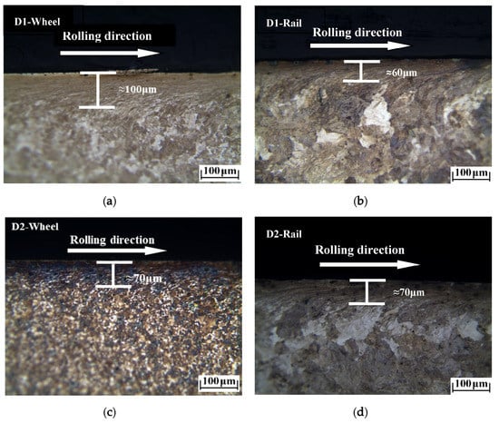 The plastic deformation morphologies were obtained by metallographic treatment of the wheel and rail samples. In Figure 9, Figure 10 and Figure 11, it can be seen that at different temperatures, the D1 and D2 friction pairs showed the same change trend in plastic deformation thickness, with the greatest plastic deformation at −30 °C, and the least plastic deformation at room temperature. At the same temperature, the plastic deformation thickness of D1 was larger than that of D2, which means better deformation resistance of D2 and is consistent with the results of surface hardening. Compared to the wheel roller, the rail roller showed strong resistance to deformation, and the greatest plastic deformation occurred at −30 °C, similar to what observed for the wheel roller.