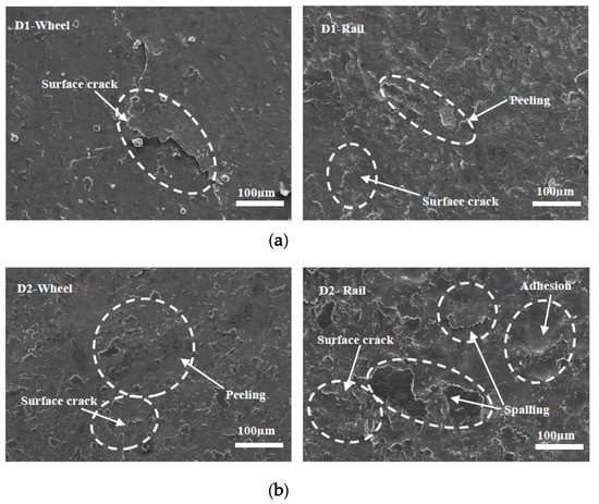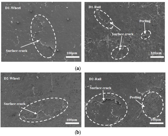 SEM micrographs showing the types of damage of wheel and rail rollers at −30 °C. (a) D1; (b) D2.