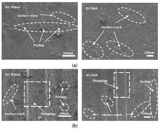 Micrographs of the worn surfaces of the wheel and rail rollers at different temperatures are shown in Figure 12, Figure 13 and Figure 14. It can be seen in Figure 12 that at 50 °C, peeling and surface crack damage occurred on the surfaces of the D1 friction pair, while for the D2 friction pair, damage was mostly due to large surface cracks. The surface damage was mild at room temperature, and peeling was the main damage on the surface of the D1 wheel roller, while surface cracks were predominant on the rail roller (Figure 13). Moreover, mixed damage consisting of ploughing, peeling, and surface cracks was present on the surfaces of the D2 friction pair at room temperature. When the temperature decreased to −30 °C, the surface damage aggravated (Figure 14). For the D1 friction pair, surface fatigue crack was the main type of damage on the surface of the wheel roller, while slight peeling and surface cracks were predominant on the rail surface. The surface damage of the D2 wheel roller was relatively mild and was mainly due to peeling, while a combination of large adhesion areas, spalling, and surface cracks was observed on the rail surface. With the temperature declining, the surface damage gradually increased and transformed from surface cracks and peeling to spalling and adhesion damage. Overall, the surface damage of the D2 wheel and rail samples was more serious than that of the D1 wheel and rail samples.