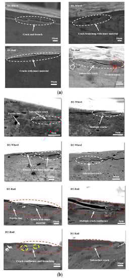 As for the fatigue characteristics of wheel and rail materials, they can be analyzed from a microscopic and kinematic perspective. With the action of Cyclic loading caused branch cracks, and inclusions inside cracks appeared during fatigue crack propagation in D1 and D2 wheel rollers. The subsurface damage of the rail material was more serious than that of the wheel material. Especially at 50 °C and −30 °C, crack growth, internal inclusions, and subsurface cracks in the rail material were more serious than at room temperature, indicating that the temperature had a significant impact on the damage of the wheel and rail materials. When the material was locally subjected to large contact stress during periodic cycle loading, surface cracks developed forming secondary branches or connections with subsurface cracks, thus extending inside the material. This resulted in further deformation and crushing of the cracks, causing accumulation of material inside the cracks. In some of these cracks, the inclusions accelerated crack propagation to the surface, material fracture under high cyclic load, and surface peeling and spalling. At the same time, the connection of several adjacent surface cracks or of surface and subsurface cracks led to crack growth, material surface peeling, or lamellar material accumulation inside the cracks, which progressed with cyclic loading (Figure 15a). The fatigue cracks generated in the D1 and D2 wheel materials also branched during cyclic loading (Figure 15, Figure 16b and Figure 17).