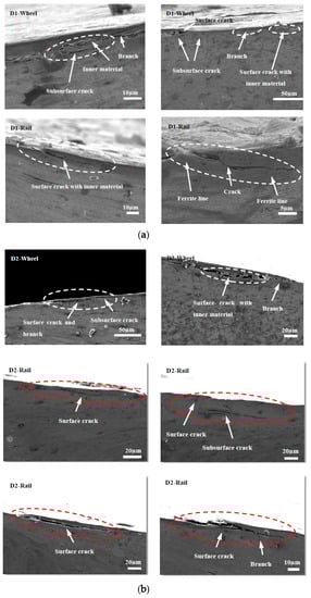 Figure 15, Figure 16 and Figure 17 show the subsurface damage of the D1 and D2 friction pairs at 50 °C, room temperature, and −30 °C, respectively. At 50 °C and −30 °C, the fatigue crack length and angle of the D1 and D2 wheel and rail rollers were larger compared to those at room temperature. It can be seen from Figure 15 and Figure 16 that the subsurface fatigue crack of the D2 wheel roller was relatively short and deep compared with that of the D1 wheel roller at 50 °C and room temperature. The long fatigue crack of D1 propagated along the surface, while the short fatigue crack of D2 extended slightly inward, with a small angle, while at −30 °C the subsurface damage of the D1 and D2 wheel rollers was accompanied by subsurface crack and a long internal crack in the material (Figure 17). For the rail roller, the main damage at room temperature was a long crack extending parallel to the surface and a subsurface crack. Under the conditions of 50 °C and −30 °C, there was a lamellar material inclusion inside the surface crack of the rail roller (Figure 15b); the crack extended to the inside and branched, so that subsurface crack damage increased compared with what observed at room temperature, becoming especially serious at −30 °C. The results showed that the subsurface damage of D1 was serious compared to that of D2 at the same temperature. Subsurface damage was severely affected by low temperature and less severely by 50 °C; the slightest subsurface damage to the two kinds of wheel materials was observed at room temperature.