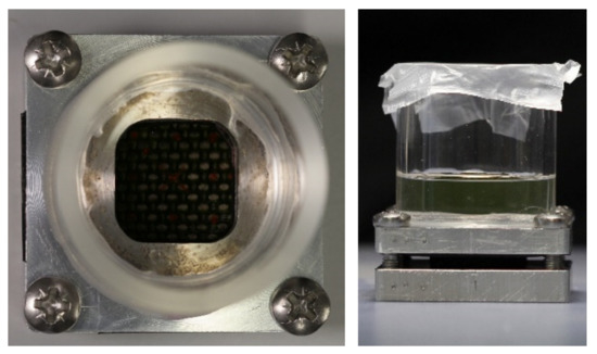 Before testing, the specimens were placed at 50 °C for 24 h to dry them and standardize the initial test conditions. When reached the room temperature, the dried samples were put in the holder in Figure 1. It was used to place distilled water at 24 °C onto a surface of the sample, avoiding the edge effect. The holders were placed in a climatic chamber at controlled temperature at 24 °C, where the water uptake process took place. The water uptake was evaluated according to the ASTM D570 specifications [19]. The specimen weight was recorded every 24 h up to 336 h. The water gain percentage was determined. A subsequent phase of drying was performed before the characterization.