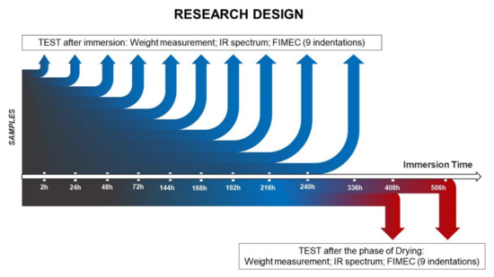 In the present study, the innovative application of FIMEC in the field of water uptake characterization was investigated, aiming at verifying the ability of the testing procedure to discriminate among different surface conditions. Two typologies of coating for water absorption reduction were considered, so as to define different scenarios for the validation of the proposed procedure. FIMEC results obtained for uncoated samples and coated by water repellent or hydrophobic resins were compared. In particular, siloxane and silicon-based coatings were formulated and applied on a part of samples to reduce the moisture absorption of the material. The choice was determined by the protective performance exhibited by these coatings on metals. In particular, the latter type is widely used as protective barriers for metal substrates, and the resulting coatings have been deeply characterized in terms of morphology, scratch resistance, and tribological performance [16,17]. In the present study a formulation was defined for composite substrates.
