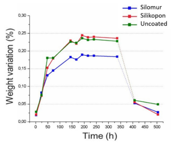 Figure 3 shows the moisture absorption of the three types of samples (uncoated, coated by Silomur and Silikopon) as a function of time. The continuous lines connect experimental points related to the various step of ageing in water; the dotted lines indicate a phase of drying in the oven, which returned the specimens to the initial conditions. As expected, an increase in weight was due to the water absorption, and a plateau was reached within 200 h.