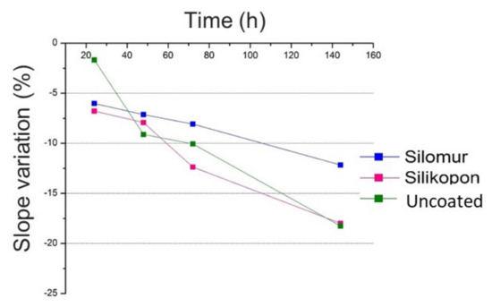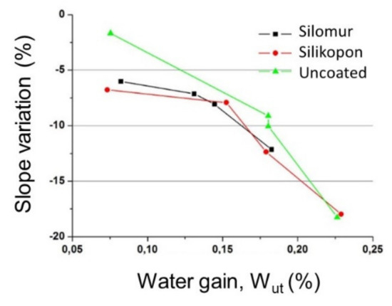 The reduction of the FIMEC slope is presented in Figure 3. The average values of slope from the nine repetitions were considered to obtain the graph. It stated that the FIMEC test is suited to the evaluation of the water uptake in composite materials, since a decreasing trend was evident. Moreover, it is practical to discriminate various surface conditions of the same substrate, in fact a different slope was observed for the three typologies of sample (uncoated, coated by Silomur and by Silikopon). A different behavior was observed for samples coated by Silomur, the ones that absorbed the water in less concentration (Figure 4).