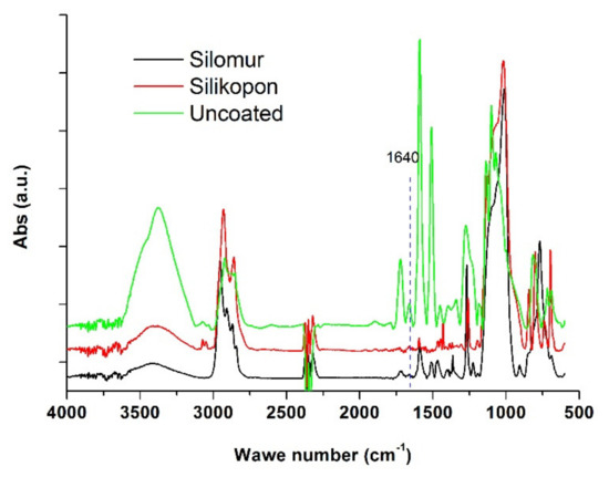 IR spectrum of Silomur, Silikopon EF, and uncoated samples at the initial time.