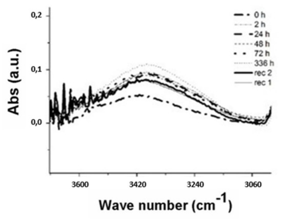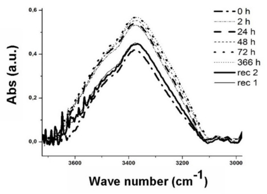 The spectra show that as the water exposure (hours) increase, the peak tends to rise due to the water uptake phenomenon. A decrease in absorbance is obtained after 336 h, being the three types of samples subjected to the process of recovery of the initial conditions by means of a vacuum oven (pressure −1 bar) at 35 °C. After the water gain steps the two phases of drying (recovery), rec 2 and rec 1, were performed at 408 h and 504 h, respectively.