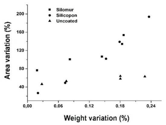 Correlation graphs of percentage variations of areas and weights for uncoated samples and coated by the Silomur or Silicopon.