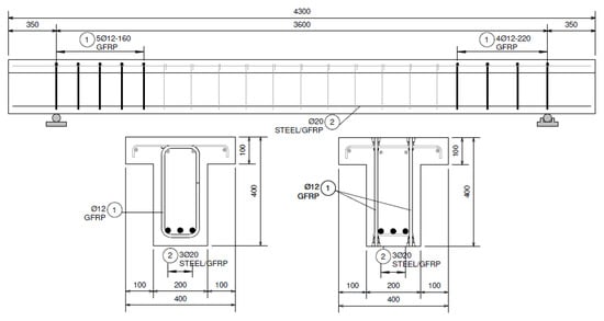 The beams were designed as T-sections with a 400 mm section height, 100 mm flange height, 400 mm flange width, and 200 mm web width. The total length of the beams was 4300 mm. The elements differed in the type of longitudinal reinforcement and the type of shear reinforcement. Twenty millimeter steel bars and 20 mm GFRP bars were used as longitudinal tensile reinforcement. GFRP stirrups with a diameter of 12 mm and GFRP headed bars with a diameter of 12 mm were used as shear reinforcement. Each beam was designed with two differently reinforced support zones; the same type of reinforcement was used throughout the entire beam, but the spacing of stirrups and headed bars was differentiated. The beams were designed so that the shear zones had the same area of tensioned bars taken into account in dowel action. A high class of concrete was used (concrete compressive strength around 70 MPa), and the T-section was used in order to increase the flexure strength. The method of reinforcing research elements is shown in Table 1 and Figure 1. Figure 2 presents the reinforcement cages of selected beams.