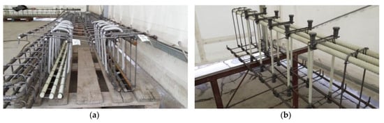 As longitudinal reinforcement, steel bars with a diameter of 20 mm and a characteristic yield strength of 500 MPa and GFRP bars with a diameter of 20 mm and an average tensile strength > 1100 MPa, as declared by the manufacturer, were used. The modulus of elasticity of the steel bars and GFRP bars was 200 GPa and 57 GPa, respectively, as declared by the manufacturer. GFRP stirrups with a diameter of 12 mm and headed bars with a diameter of 12 mm were used as shear reinforcement.