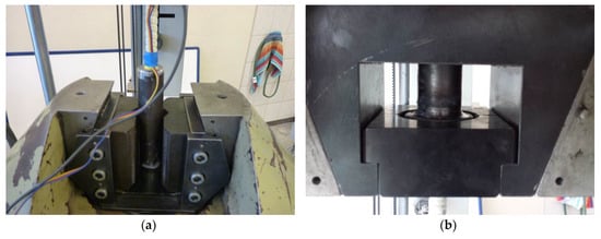 Straight bars were stretched in a testing machine using classic jaws used for the tensile test (Figure 4a), steel bars among others. The end in the form of a steel flange was fixed in a special jaw shown in Figure 4b. The use of this type of jaw, with an appropriate wall thickness of the steel tube, eliminated clamping forces that might have distorted the result of the actual anchoring strength.