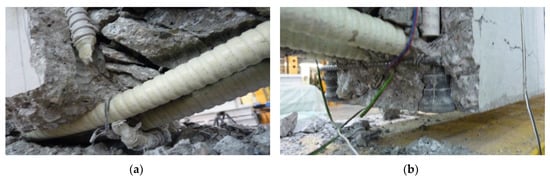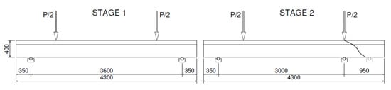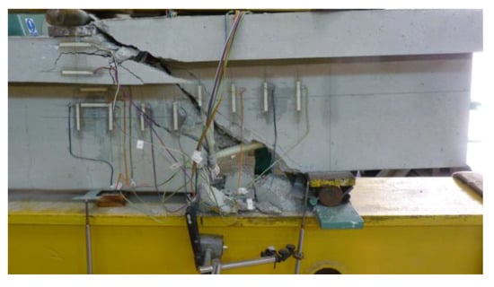 All beams were designed in order to obtain the failure in the support zone. All the support zones were damaged as a result of the failure of the transverse reinforcement cut through a diagonal crack (shear–tension failure) (Figure 8).