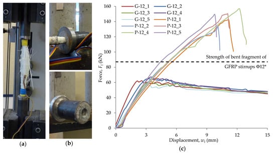Based on the data provided by the manufacturer and by Kurth [], the average tensile strength of the stirrups used was set at fbend = 770 MPa and the mean value of modulus of elasticity at E = 57 GPa. The stirrups used in this study were bent during manufacture, and the bending diameter was seven times the diameter of the bar (84 mm). The stirrups shaped in the same way were the subject of research by the manufacturer and Kurth in []. In this study, the stress-strain characteristics of GFRP stirrups were not experimentally determined, and the values of the tensile strength and modulus of elasticity of GFRP stirrups were taken from the manufacturer’s data, which were consistent with Kurth’s results [].