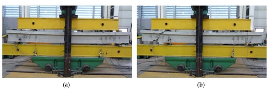 Each beam was tested in two stages in order to obtain results from eight support zones. Figure 7 presents an example on the B-1 beam on the test stand during the first and second stages of the test.